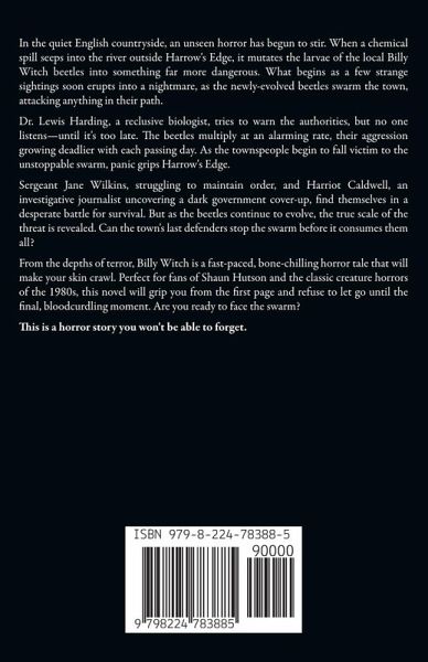 In the quiet English countryside, an unseen horror has begun to stir. When a chemical spill seeps into the river outside Harrow's Edge, it mutates the larvae of the local Billy Witch beetles into something far more dangerous. What begins as a few strange sightings soon erupts into a nightmare, as the newly-evolved beetles swarm the town, attacking anything in their path. Dr. Lewis Harding, a reclusive biologist, tries to warn the authorities, but no one listens-until it's too late. The beetles multiply at an alarming rate, their aggression growing deadlier with each passing day. As the townspeople begin to fall victim to the unstoppable swarm, panic grips Harrow's Edge. Sergeant Jane Wilkins, struggling to maintain order, and Harriot Caldwell, an investigative journalist uncovering a dark government cover-up, find themselves in a desperate battle for survival. But as the beetles continue to evolve, the true scale of the threat is revealed. Can the town's last defenders stop the swarm before it consumes them all? From the depths of terror, Billy Witch is a fast-paced, bone-chilling horror tale that will make your skin crawl. Perfect for fans of Shaun Hutson and the classic creature horrors of the 1980s, this novel will grip you from the first page and refuse to let go until the final, bloodcurdling moment. Are you ready to face the swarm? This is a horror story you won't be able to forget.