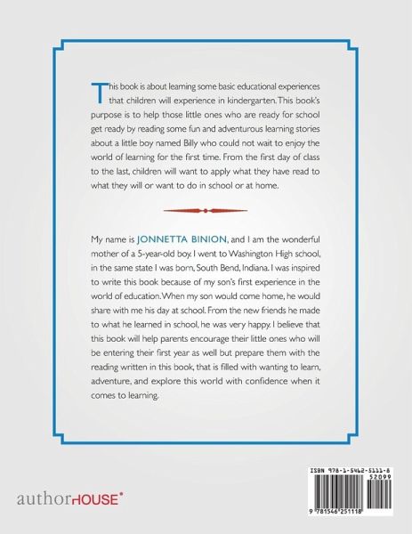 This book is about learning some basic educational experiences that children will experience in kindergarten. This books purpose is to help those little ones who are ready for school get ready by reading some fun and adventurous learning stories about a little boy named Billy who could not wait to enjoy the world of learning for the first time. From the first day of class to the last, children will want to apply what they have read to what they will or want to do in school or at home.