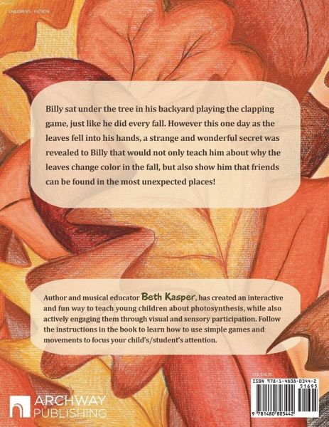 Billy sat under the tree in his backyard playing the clapping game, just like he did every fall. However this one day as the leaves fell into his hands, a strange and wonderful secret was revealed to Billy that would not only teach him about why the leaves change color in the fall, but also show him that friends can be found in the most unexpected places!