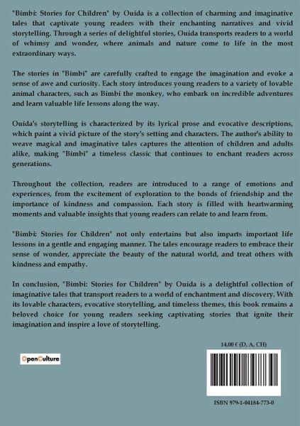 "Bimbi: Stories for Children" by Ouida presents a touching tale of a young boy named August Strehla, who lives in the quaint town of Hall in the Tyrol region. August is deeply attached to a magnificent old stove, a masterpiece crafted by the renowned potter Augustin Hirschvogel. This stove, a family heirloom, is not just a source of warmth but a symbol of comfort and joy for August and his siblings. However, their father, burdened by financial difficulties, decides to sell the stove to a trader, intending to send it to Munich. The news devastates August, who views the stove as a living entity and a cherished family member. In a desperate attempt to keep the stove, August hides inside it as it is transported away. His journey is fraught with fear and uncertainty, yet driven by an unwavering love for the stove and a desire to reunite it with his family. The story explores themes of poverty, familial bonds, and the innocence of childhood, highlighting August's courage and determination in the face of adversity. Through August's eyes, the stove becomes a symbol of hope and resilience, embodying the spirit of a bygone era and the warmth of home.