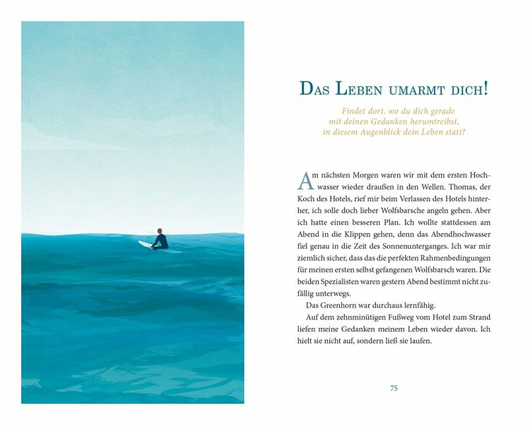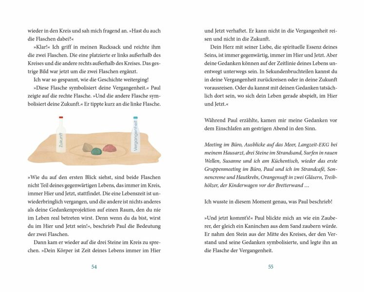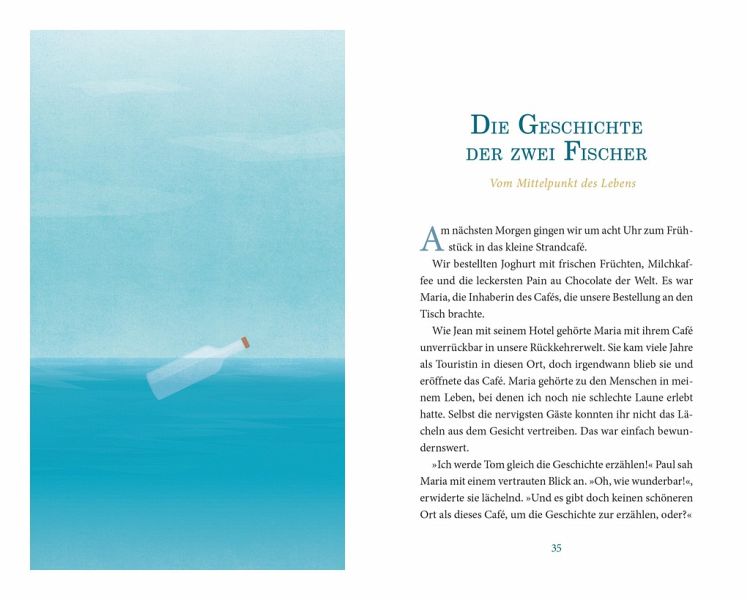 Doch dann erzählt ihm Paul die Geschichte von zwei Fischern auf der Suche nach dem idealen Fang und langsam beginnt Tom zu verstehen, wie sehr die fortwährende Überforderung im Alltag ihn daran hindert, im Hier und Jetzt anzukommen. Wie lässtsich das Gedankenkarussell aus alten Verletzungen, der Sorge und Angst vor dem, was kommen mag, bloß stoppen? Anschaulich zeigt ihm Paul anhand eines Modells, wie er wieder zur eigenen Mitte finden kann. Dabei kommen ein Kreis, zwei Flaschen und drei Steine zum Einsatz, die sinnbildlich zeigen, was nötig ist, damit ein erfülltes Leben gelingt. Vor allem aber, wie Tom es auch dann führen kann, wenn die Auszeit am Meer vorbei ist.