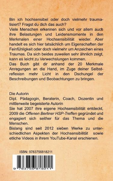 Bin ich hochsensibel oder doch vielmehr traumatisiert? Fragst du dich das auch? Viele Menschen erkennen sich und vor allem auch ihre Belastungen und Leidensmomente in den Merkmalen einer Hochsensibilität wieder. Aber handelt es sich hier tatsächlich um Eigenschaften der Feinfühligkeit oder doch vielmehr um Anzeichen eines Traumas. Da sich beides zuweilen sehr ähnlich zeigt, kann es leicht zu Verwechslungen kommen. Das Buch gibt dir anhand der 20 Merkmale Anregungen an die Hand, im Zuge deiner Selbst-reflexion mehr Licht in den Dschungel der Beschreibungen und Beobachtungen zu bringen