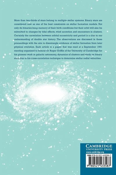 More than two-thirds of stars belong to multiple stellar systems. Binary stars are considered now as one of the best constraints on stellar formation models. Not only do binaries keep memory of their birth conditions but their orbit will also be subjected to changes by tidal effects, wind accretion and encounters in clusters. Certainly the correlation between orbital eccentricity and period is a clue to our understanding of double star history. These proceedings aim to disentangle evidence of stellar formation from later physical evolution. Each article in this 1992 volume is a paper that was read at a meeting organized to honour Dr Roger Griffin of the University of Cambridge for his pioneer work in galactic astronomy, dynamics of clusters and study on binary stars due to his cross-correlation technique to determine stellar radial velocities.