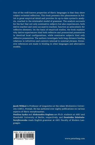 One of the well-known properties of Slavic languages is that they show subject-oriented reflexives. This book presents this phenomenon in Polish in great empirical detail and provides its up-to-date syntactic analysis, couched in the minimalist model of grammar. The analysis accounts for the fact that not only nominative subjects but also experiencers, both dative-marked and some accusative-marked, function as antecedents for reflexive elements. On the basis of empirical studies, the book explains why dative experiencers bind both reflexive and pronominal possessives in identical local configurations, while nominatve subjects bind only reflexive possessives. The authors investigate both long-distance binding relations in infinitives and contexts internal to nominal phrases. Extensive references are made to binding in other languages and alternative models.