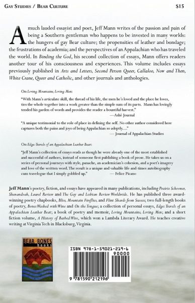 A much lauded essayist and poet, Jeff Mann writes of the passion and pain of being a Southern gentleman who happens to be invested in many worlds: the hungers of gay Bear culture; the propensities of leather and bondage; the frustrations of academia; and the perspectives of an Appalachian who has traveled the world. In Binding the God, his second collection of essays, Mann offers readers another tour of his consciousness and experiences. This volume includes essays previously published in Arts and Letters, Second Person Queer, Callaloo, Now and Then, White Crane, Queer and Catholic, and other journals and anthologies.
