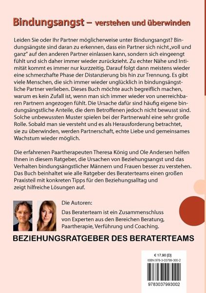 Leiden Sie oder Ihr Partner möglicherweise unter Bindungsangst? Unerkannte Bindungsängste führen fast immer zu Trennungen und sich wiederholenden Mustern. Bindungsängste sind daran zu erkennen, dass ein Partner sich nicht voll und ganz auf den anderen Partner einlassen kann, sondern sich eingeengt fühlt und sich daher immer wieder zurückzieht. Zu echter Nähe und Intimität kommt es immer nur kurzzeitig. Darauf folgt dann meistens wieder eine schmerzhafte Phase der Distanzierung bis hin zur Trennung. Es gibt viele Menschen, die sich immer wieder unglücklich in bindungsängstliche Partner verlieben. Dieses Buch möchte auch begreiflich machen, warum es kein Zufall ist, wenn man sich immer wieder von unerreichbaren Partnern angezogen fühlt. Manchmal ist man auch selbst der unerreichbare Partner. Die Ursache dafür sind häufig eigene bindungsängstliche Anteile, die dem Betroffenen jedoch nicht bewusst sind. Solche unbewussten Muster spielen bei der Partnerwahl eine sehr große Rolle. Sobald man sie versteht und es als Herausforderung betrachtet, sie zu überwinden, werden Partnerschaft, echte Liebe und gemeinsames Wachstum wieder möglich.Die erfahrenen Paartherapeuten Theresa König und Ole Andersen helfen Ihnen in diesem Ratgeber, die Ursachen von Beziehungsangst und das Verhalten bindungsängstlicher Männern und Frauen besser zu verstehen. Das Buch beinhaltet wie alle Ratgeber des Beraterteams einen großen Praxisteil mit konkreten Tipps für den Beziehungsalltag und zeigt hilfreiche Lösungen auf, denn es gibt einen Ausweg aus der Bindungsangst.