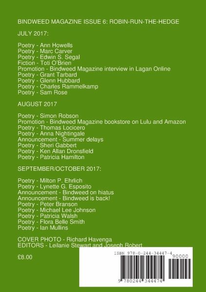 Bindweed Magazine Issue 7: Robin-run-the-Hedge contains poetry and fiction by Ann Howells, Marc Carver, Edwin S. Segal, Toti O'Brien, Grant Tarbard, Glenn Hubbard, Charles Rammelkamp, Sam Rose, Simon Robson, Thomas Locicero, Anna Nightingale, Sheri Gabbert, Ken Allan Dronsfield, Patricia Hamilton, Milton P. Ehrlich, Lynette G. Esposito, Peter Branson, Michael Lee Johnson, Patricia Walsh, Flora Belle Smith and Ian Mullins. Cover photography by Richard Havenga. Edited by Leilanie Stewart and Joseph Robert.