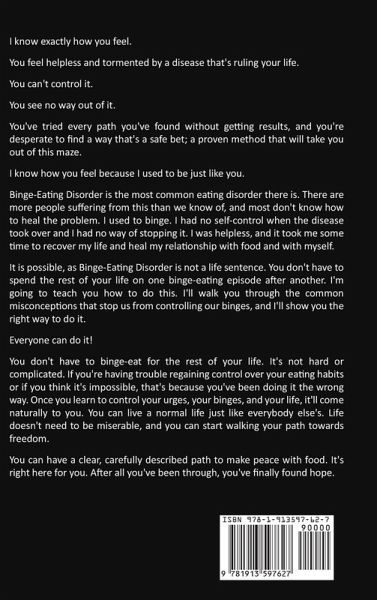 I know exactly how you feel. You feel helpless and tormented by a disease that's ruling your life. You can't control it. You see no way out of it. You've tried every path you've found without getting results, and you're desperate to find a way that's a safe bet; a proven method that will take you out of this maze. I know how you feel because I used to be just like you. Binge-Eating Disorder is the most common eating disorder there is. There are more people suffering from this than we know of, and most don't know how to heal the problem. I used to binge. I had no self-control when the disease took over and I had no way of stopping it. I was helpless, and it took me some time to recover my life and heal my relationship with food and with myself. It is possible, as Binge-Eating Disorder is not a life sentence. You don't have to spend the rest of your life on one binge-eating episode after another. I'm going to teach you how to do this. I'll walk you through the common misconceptions that stop us from controlling our binges, and I'll show you the right way to do it. Everyone can do it! You don't have to binge-eat for the rest of your life. It's not hard or complicated. If you're having trouble regaining control over your eating habits or if you think it's impossible, that's because you've been doing it the wrong way. Once you learn to control your urges, your binges, and your life, it'll come naturally to you. You can live a normal life just like everybody else's. Life doesn't need to be miserable, and you can start walking your path towards freedom. You can have a clear, carefully described path to make peace with food. It's right here for you. After all you've been through, you've finally found hope.