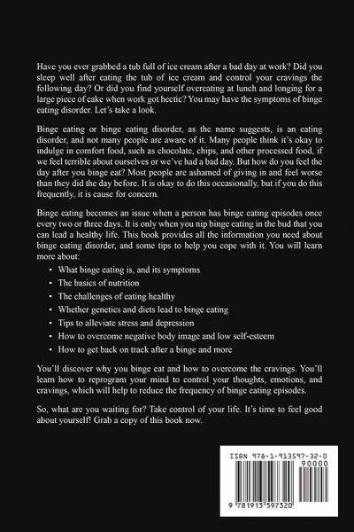 Have you ever grabbed a tub full of ice cream after a bad day at work? Did you sleep well after eating the tub of ice cream and control your cravings the following day? Or did you find yourself overeating at lunch and longing for a large piece of cake when work got hectic? You may have the symptoms of binge eating disorder. Let's take a look.Binge eating or binge eating disorder, as the name suggests, is an eating disorder, and not many people are aware of it. Many people think it's okay to indulge in comfort food, such as chocolate, chips, and other processed food, if we feel terrible about ourselves or we've had a bad day. But how do you feel the day after you binge eat? Most people are ashamed of giving in and feel worse than they did the day before. It is okay to do this occasionally, but if you do this frequently, it is cause for concern. Binge eating becomes an issue when a person has binge eating episodes once every two or three days. It is only when you nip binge eating in the bud that you can lead a healthy life. This book provides all the information you need about binge eating disorder, and some tips to help you cope with it. You will learn more about:¿ What binge eating is, and its symptoms ¿ The basics of nutrition¿ The challenges of eating healthy¿ Whether genetics and diets lead to binge eating¿ Tips to alleviate stress and depression¿ How to overcome negative body image and low self-esteem¿ How to get back on track after a binge and moreYou'll discover why you binge eat and how to overcome the cravings. You'll learn how to reprogram your mind to control your thoughts, emotions, and cravings, which will help to reduce the frequency of binge eating episodes. So, what are you waiting for? Take control of your life. It's time to feel good about yourself! Grab a copy of this book now.