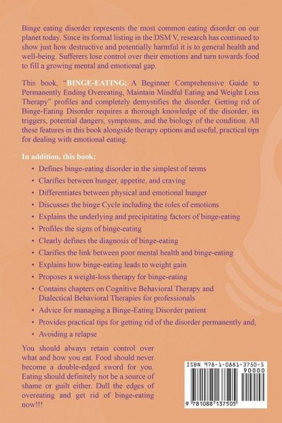 Binge eating disorder represents the most common eating disorder on our planet today. Since its formal listing in the DSM V, research has continued to show just how destructive and potentially harmful it is to general health and well-being. Sufferers lose control over their emotions and turn towards food to fill a growing mental and emotional gap. This book, "BINGE-EATING; A Beginner Comprehensive Guide to Permanently Ending Overeating, Maintain Mindful Eating and Weight Loss Therapy" profiles and completely demystifies the disorder. Getting rid of Binge-Eating Disorder requires a thorough knowledge of the disorder, its triggers, potential dangers, symptoms, and the biology of the condition. All these features in this book alongside therapy options and useful, practical tips for dealing with emotional eating. In addition, this book;Defines binge-eating disorder in the simplest of terms Clarifies between hunger, appetite, and craving Differentiates between physical and emotional hunger Discusses the binge Cycle including the roles of emotions Explains the underlying and precipitating factors of binge-eating Profiles the signs of binge-eating Clearly defines the diagnosis of binge-eating Clarifies the link between poor mental health and binge-eating Explains how binge-eating leads to weight gain Proposes a weight-loss therapy for binge-eating Contains chapters on Cognitive Behavioral Therapy and Dialectical Behavioral Therapies for professionals Advice for managing a Binge-Eating Disorder patient Provides practical tips for getting rid of the disorder permanently and, Avoiding a relapse You should always retain control over what and how you eat. Food should never become a double-edged sword for you. Eating should definitely not be a source of shame or guilt either. Dull the edges of overeating and get rid of binge-eating now!!!