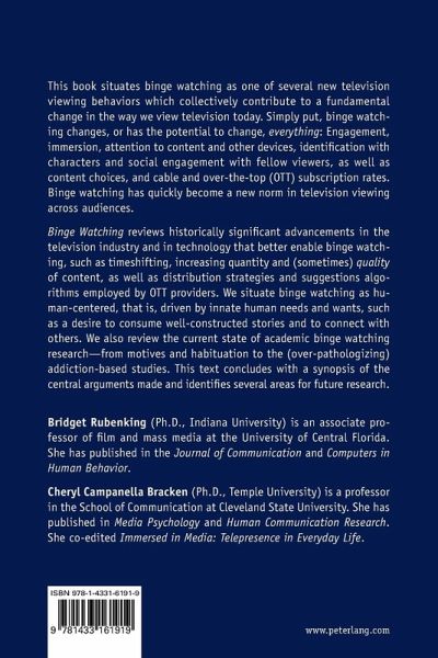 This book situates binge watching as one of several new television viewing behaviors which collectively contribute to a fundamental change in the way we view television today. Simply put, binge watching changes, or has the potential to change, everything: Engagement, immersion, attention to content and other devices, identification with characters and social engagement with fellow viewers, as well as content choices, and cable and over-the-top (OTT) subscription rates. Binge watching has quickly become a new norm in television viewing across audiences.