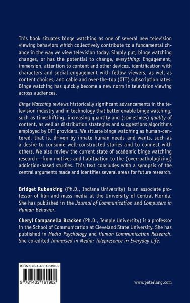 This book situates binge watching as one of several new television viewing behaviors which collectively contribute to a fundamental change in the way we view television today. Simply put, binge watching changes, or has the potential to change, everything: Engagement, immersion, attention to content and other devices, identification with characters and social engagement with fellow viewers, as well as content choices, and cable and over-the-top (OTT) subscription rates. Binge watching has quickly become a new norm in television viewing across audiences.
