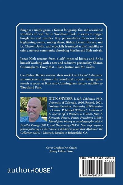 Bingo is a simple game, a format for gossip, fun and occasional windfalls of cash. Yet in Woodland Park, it seems to trigger burglaries and murder. Key personalities focus on these frightening events, among them, Bishop Leland Burkey, and Lt. Chester Devlin, each especially frustrated at their inability to calm a nervous community absorbing Muslim and Sikh arrivals. Jonas Kirk returns from a self-imposed hiatus and finds himself working with a new and seductive personality, Sharon Cunningham. Fancy that-Lady Justice and Mr. Scales. Can Bishop Burkey sanction their work? Can Devlin? A dramatic announcement captures the crowd and a special Bingo game reveals a secret as Kirk and Cunningham restore stability to Woodland Park.