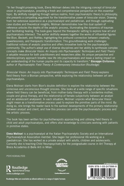 Elena Molinari starts from Bion's double definition to explore the relationship between the conscious and unconscious thought process. She looks at a wide range of specific situations where field theory can be beneficial, from mother-baby therapy with a borderline mother, couple and group therapy, and the relationship of female subjectivity between an analyst and an adolescent analysand. In each situation, Molinari unpicks what Binocular Vision might mean as a transformative process used to explore the primitive parts of the mind. By doing so, she brings the reader back to the earliest developments of the primary relationship between analyst and client, and how this process can unite the psychoanalytic process and the artistic process.