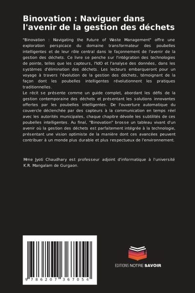 "Binovation : Navigating the Future of Waste Management" offre une exploration perspicace du domaine transformateur des poubelles intelligentes et de leur rôle central dans le façonnement de l'avenir de la gestion des déchets. Ce livre se penche sur l'intégration des technologies de pointe, telles que les capteurs, l'IdO et l'analyse des données, dans les systèmes d'élimination des déchets. Les lecteurs embarqueront pour un voyage à travers l'évolution de la gestion des déchets, témoignant de la façon dont les poubelles intelligentes révolutionnent les pratiques traditionnelles.Le récit se présente comme un guide complet, abordant les défis de la gestion contemporaine des déchets et présentant les solutions innovantes offertes par les poubelles intelligentes. De l'ouverture automatique du couvercle déclenchée par des capteurs à la communication en temps réel avec les autorités municipales, chaque chapitre dévoile les subtilités de ces poubelles intelligentes. Au final, "Binovation" brosse un tableau vivant d'un avenir où la gestion des déchets est parfaitement intégrée à la technologie, présentant une vision optimiste de la manière dont ces avancées peuvent contribuer à un monde plus durable et plus respectueux de l'environnement.
