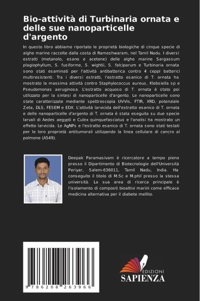 In questo libro abbiamo riportato le proprietà biologiche di cinque specie di alghe marine raccolte dalla costa di Rameshwaram, nel Tamil Nadu. I diversi estratti (metanolo, esano e acetone) delle alghe marine Sargassum plagiophyllum, S. fusiforme, S. wightii, S. falciparum e Turbinaria ornata sono stati esaminati per l'attività antibatterica contro 4 ceppi batterici multiresistenti. Tra i diversi estratti, l'estratto esanico di T. ornata ha mostrato la massima attività contro Staphylococcus aureus, Klebsiella sp e Pseudomonas aeruginosa. L'estratto acquoso di T. ornata è stato poi utilizzato per la sintesi di nanoparticelle d'argento. Le nanoparticelle sono state caratterizzate mediante spettroscopia UV-Vis, FTIR, XRD, potenziale Zeta, DLS, FESEM e EDX. L'attività larvicida dell'estratto esanico di T. ornata e delle nanoparticelle d'argento di T. ornata è stata eseguita su due specie larvali di Aedes aegypti e Culex quinquefasciatus e l'analisi ha mostrato un effetto larvicida. Le AgNPs e l'estratto esanico di T. ornata sono stati testati per le loro proprietà antitumorali utilizzando la linea cellulare di cancro al polmone (A549).