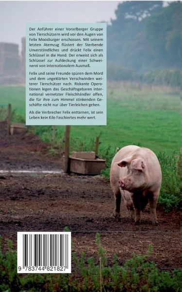 Der Anführer einer Vorarlberger Gruppe von Tierschützern wird vor den Augen von Felix Moosburger erschossen. Mit seinem letzten Atemzug flüstert der Sterbende Unverständliches und drückt Felix einen Schlüssel in die Hand. Der erweist sich als Schlüssel zur Aufdeckung einer Schweinerei von internationalem Ausmaß.Felix und seine Freunde spüren dem Mord und dem ungeklärten Verschwinden weiterer Tierschützer nach. Riskante Operationen legen das Geschäftsgebaren international vernetzter Fleischhändler offen, die für ihre zum Himmel stinkenden Geschäfte nicht nur über Tierleichen gehen. Als die Verbrecher Felix enttarnen, ist sein Leben kein Kilo Faschiertes mehr wert.