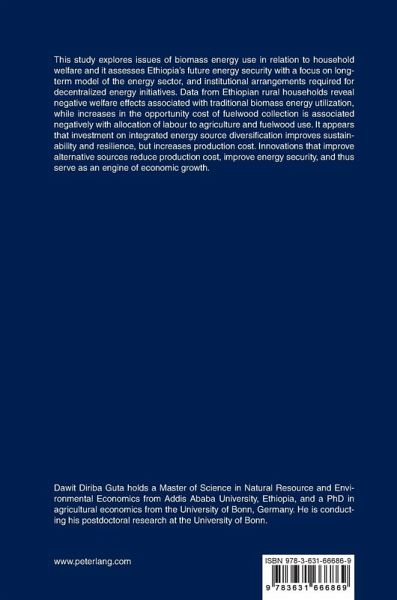 Contents: Analysis of biomass energy use in Ethiopian households - Fixed Effect Two-Stage Least Squares - Dynamic long-term model for Ethiopia's energy sector - Agricultural household model - Fuelwood scarcity, cross-wage effects, and their welfare implications - Household energy mix decision and substitution between energy sources - Determinants of household bio-based energy use - Household labour allocation by activities - Household joint labour allocation to livelihood activities - Determinants of household food and energy expenditures - Household bio-based energy utilization and welfare effects of fuelwood scarcity - Decentralized clean energy generation and use - Assessing energy security, uncertainty and renewable energy options - Effects of technological and efficiency innovations on electricity production mix - Institutions and collective action theories - Bottlenecks and barriers to rural renewable energy use - Participatory forest management.