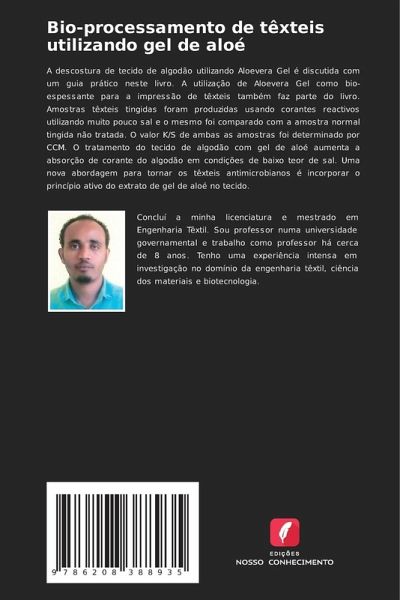 A descostura de tecido de algodão utilizando Aloevera Gel é discutida com um guia prático neste livro. A utilização de Aloevera Gel como bio-espessante para a impressão de têxteis também faz parte do livro. Amostras têxteis tingidas foram produzidas usando corantes reactivos utilizando muito pouco sal e o mesmo foi comparado com a amostra normal tingida não tratada. O valor K/S de ambas as amostras foi determinado por CCM. O tratamento do tecido de algodão com gel de aloé aumenta a absorção de corante do algodão em condições de baixo teor de sal. Uma nova abordagem para tornar os têxteis antimicrobianos é incorporar o princípio ativo do extrato de gel de aloé no tecido.