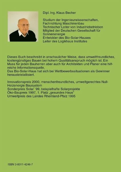 Dieses Buch beschreibt in anschaulicher Weise, das umweltfreundliches, kostengünstiges Bauen bei hohem Qualitätsanspruch möglich ist. Ein Muss für jeden Bauherren aber auch für Architekten und Planer eine hilfreiche Informationsquelle. Das Bio-Solar-Haus hat sich bei Wettbewerbssituationen als Gewinner herauskristallisiert. Innovationspreis 2000, menschenfreundliches, umweltgerechtes Null-Heizenergie Bausystem. Sonderpreis Solar `99, beispielhafte Solarprojekte. Öko-Baupreis 1997, 1. Platz. Umweltpreis des Landes Rheinland-Pfalz 1995