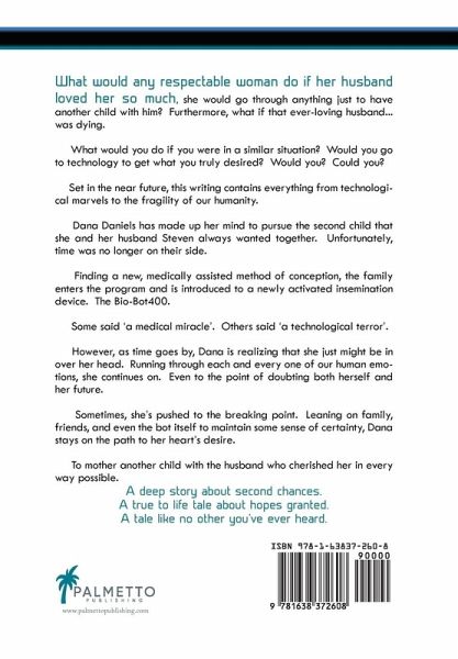 What would any respectable woman do if her husband loved her so much, she would go through anything just to have another child with him? Furthermore, what if that ever-loving husband.......was dying. What would you do if you were in a similar situation? Would you go to technology to get what you truly desired? Would you? Could you? Set in the near future, this writing contains everything from technological marvels to the fragility of our humanity. Dana Daniels has made up her mind to pursue the second child that she and her husband Steven always wanted together. Unfortunately, time was no longer on their side. Finding a new, medically assisted method of conception, the family enters the program and is introduced to a newly activated insemination device. The Bio-Bot400. Some said 'a medical miracle'. Others said 'a technological terror'. However, as time goes by, Dana is realizing that she just might be in over her head. Running through each and every one of our human emotions, she continues on. Even to the point of doubting both herself and her future. Sometimes, she's pushed to the breaking point. Leaning on family, friends, and even the bot itself to maintain some sense of certainty, Dana stays on the path to her heart's desire. To mother another child with the husband who cherished her in every way possible. A deep story about second chances. A true to life tale about hopes granted. A tale like no other you've ever heard.