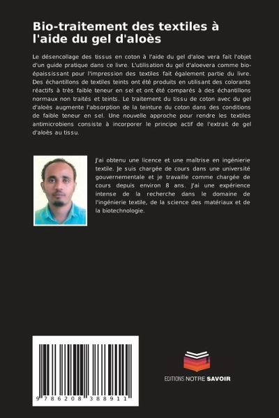Le désencollage des tissus en coton à l'aide du gel d'aloe vera fait l'objet d'un guide pratique dans ce livre. L'utilisation du gel d'aloevera comme bio-épaississant pour l'impression des textiles fait également partie du livre. Des échantillons de textiles teints ont été produits en utilisant des colorants réactifs à très faible teneur en sel et ont été comparés à des échantillons normaux non traités et teints. Le traitement du tissu de coton avec du gel d'aloès augmente l'absorption de la teinture du coton dans des conditions de faible teneur en sel. Une nouvelle approche pour rendre les textiles antimicrobiens consiste à incorporer le principe actif de l'extrait de gel d'aloès au tissu.