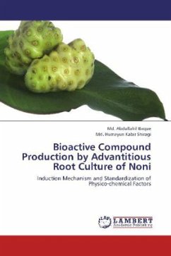 Adventitious roots were induced from 2-month-old young leaves of In vitro grown plantlets of Morinda citrifoli on Murashige and Skoog (MS) medium supplemented with 1 mg l-1 IBA. Among the different concentrations of indole-3-butyric acid (IBA) and -napthaleneacetic acid (NAA) tested, 1 mg l-1 IBA was proven as the best auxin source for adventitious root induction under fluorescent light. Accumulation of hydrogen peroxide (H2O2) in induced root under different light showed a positive correlation with peroxidation of lipids and was observed higher under far-red followed by red plus blue light. However, the strong up-regulation of ascorbate peroxidase (APX) activity under fluorescent light played an important role in detoxification of the harmful effects of H2O2. In contrast, MS medium supplemented with 5 mg l-1 IBA as sole auxin source was proven most effective for rapid root growth and volumetric production of anthraquinone (AQ), phenolics and flavonoids. The overall root growth and production of AQ, phenolics and flavonoids were maximized when adventitious roots were cultured with 1/4 MS medium supplemented with 5 mg l-1 IBA, 10 g l-1 sucrose and 15 g l-1 (FW) inoculums size.