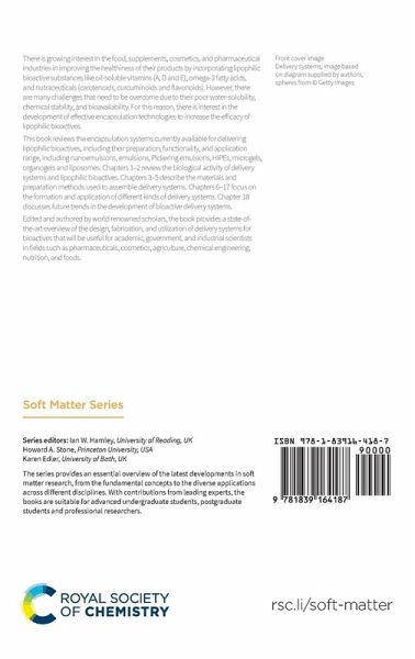There is growing interest in the food, supplements, cosmetics, and pharmaceutical industries in improving the healthiness of their products by incorporating lipophilic bioactive substances like oil-soluble vitamins (A, D and E), omega-3 fatty acids, and nutraceuticals (carotenoids, curcuminoids and flavonoids). However, there are many challenges that need to be overcome due to their poor water-solubility, chemical stability, and bioavailability. For this reason, there is interest in the development of effective encapsulation technologies to increase the efficacy of lipophilic bioactives. This book reviews the encapsulation systems currently available for delivering lipophilic bioactives, including their preparation, functionality, and application range, including nanoemulsions, emulsions, Pickering emulsions, HIPEs, microgels, organogels and liposomes. Chapters 1-2 review the biological activity of delivery systems and lipophilic bioactives. Chapters 3-5 describe the materials and preparation methods used to assemble delivery systems. Chapters 6-17 focus on the formation and application of different kinds of delivery systems. Chapter 18 discusses future trends in the development of bioactive delivery systems. Edited and authored by world renowned scholars, the book provides a state-of-the-art overview of the design, fabrication, and utilization of delivery systems for bioactives that will be useful for academic, government, and industrial scientists in fields such as pharmaceuticals, cosmetics, agriculture, chemical engineering, nutrition, and foods.