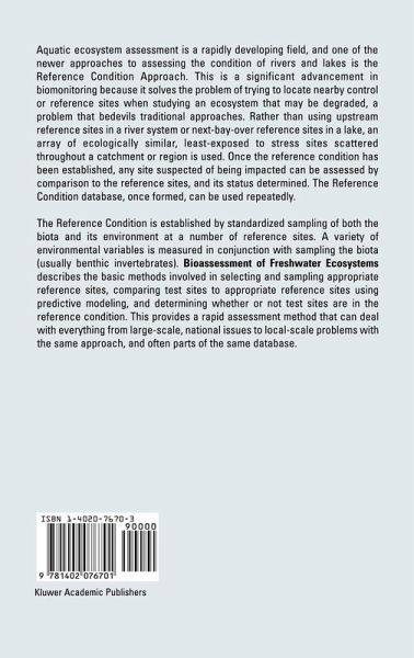 Bioassessment Of Freshwater Ecosystems.- 1. Introduction.- 2. Key concepts.- 3. Development of the Reference Condition Approach.- 4. Points to remember.- To The Case Studies.- 1. Sediment assessment of the near shore environment of North American Great Lakes.- 2. Fraser River (British Columbia) biomonitoring program.- 3. Spring and Autumn Assessment of Streams in the Australian Capital Territory.- 4. Points to remember.- Defining The Reference Condition.- 1. Define the objectives of the study.- 2. Determine the spatial extent, time-scale and grain-size of the study.- 3. Determine the criteria for acceptable reference sites.- 4. Determine the appropriate number and locations of reference sites.- 5. Choose descriptors of the benthic invertebrate community and its environment.- 6. Design a data storage and management system.- 7. Ensure data quality.- 8. Case Studies.- 9. Points to remember.- Variation In The Reference Condition.- 1. Why characterizing reference site variation is important.- 2. How to describe variation among reference sites.- 3. Case Studie.- 4. Why it is important to model and explaine variation among reference sites.- 5. How to model variation among reference sites.- 6. Why residual variation among reference communities is important.- 7. Case studies.- 8. Points to remember.- Decision-Making.- 1. Why do we need decision rules on passing and failing test sites.- 2. How are decision rules arrived at.- 3. Sensitivity of assessments: how often do real test sites fail.- 4. Case Studies.- 5. Points to remember.- Beyond Pass And Fail.- 1. Severity of fail: Magnitude and nature of deviation from Reference Condition.- 2. Why did it fail.- 3. Scenario building: What will be the effect of rehabilitation or stress.- 4. Points to remember.- The Reference Condition Approach.- 1. Bioassessment of freshwater ecosystems using the Reference Condition Approach.- 2. Case Studies.- 3. Defining the Reference Condition.- 4. Describing and modeling variation in the Reference Condition.- 5. Decision-Making.- 6. Beyond Pass and Fail.- 7. Finish.- References.
