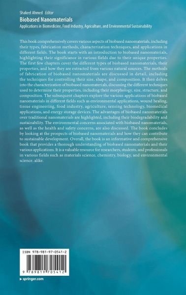 Chapter 1_Introduction to Biobased nanomaterials.- Chapter 2_Types of biobased nanomaterials.- Chapter 3_Methods of fabrication of biobased nanomaterials.- Chapter 4_Characterization of biobased nanomaterials.- Chapter 5_Biobased nanomaterials in wound healing. - Chapter 6_Biobased nanomaterials in tissue engineering.- Chapter 7_Biobased nanomaterials in biomedical applications. - Chapter 8_Biobased nanomaterials in drug delivery. - Chapter 9_Biobased anomatnerials in biosensing.- Chapter 10_Biobased nanomaterials in regenerative medicine. - Chapter 11_Health and safety concern of biobased nanomaterials. - Chapter 12_Biobased nanomaterials in food industry.- Chapter 13_Biobased nanomaterials in food packaging.- Chapter 14_Biobased nanomaterials in food preservation.- Chapter 15_Biobased nanomaterials in increasing shelf life of food.- Chapter 16_Biobased nanomaterials in nutraceuticals.- Chapter 17_Biobased nanomaterials in environmental applications.- Chapter 18_Biobased nanomaterials in wastewater treatment.- Chapter 19_Environmental concern of biobased nanomaterials.- Chapter 20_Biobased nanomaterials in agriculture.- Chapter 21_Biobased nanomaterials in sensing technology.- Chapter 22_Biobased nanomaterials in energy storage devices.- Chapter 23_Advantage of biobased nanomaterials over traditional nanomaterials.- Chapter 24_Biodegradability and sustainability of biobased nanomaterials.- Chapter 25_Future prospects of biobased nanomaterials.