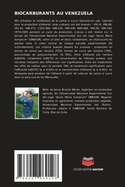 Afin d'évaluer le rendement de la canne à sucre (Saccharum spp. hybride) pour la production d'éthanol, onze cultivars ont été évalués : V91-8, V98-86, V91-01, V99-271, C323-368, V98-120, V99-236, B80-408, V00-50, V99-190, CP74-2005 pendant un cycle de production. L'essai a été réalisé sur le terrain de l'Universidad Nacional Experimental Sur del Lago "Jesús María Semprum" (UNESUR), selon un plan en blocs randomisés, en choisissant les plantes dans le sillon central de chaque parcelle expérimentale (45 m2/traitement). Les critères évalués étaient les suivants : production en tonnes de canne par hectare (TCH), tonnes de sucre par hectare (TAH), pourcentage de polysaccharides (% POL), litres d'éthanol par hectare (LtEt/hA), rendement (LtEt/TC) et concentration de l'éthanol produit. Les résultats indiquent des différences non significatives entre les traitements par effet de cultivar pour la variable TAH, et hautement significatives pour l'efficacité (LtEt/TC) (p 0,001) et la concentration d'éthanol (p 0,001). Le Venezuela peut produire de l'éthanol à partir de cultures de canne à sucre dans la zone sud du lac Maracaibo.