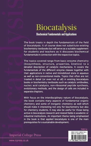 The book covers the fundamentals of the field of biocatalysis that are not treated in such detail (or even not at all) in existing biocatalysis books or biochemistry textbooks. It of course does not substitute existing biochemistry textbooks but will serve a suitable supplement as it discusses biochemical fundamentals in connection with the respective topics.With focus on the interdisciplinary nature of biocatalysis, the book contains many aspects of fundamental organic chemistry and some of inorganic chemistry as well, which should make it interesting not only for biochemistry but also for chemistry students. An important theme being emphasized in the book is that applied biocatalysis is one of the main prerequisites for a sustainable development.The topics covered ranges from basic enzyme chemistry (biosynthesis, structure, properties, interaction forces, kinetics) to a detailed description of catalytic mechanisms. It covers the fundamentals of the different enzyme classes together with their applications in native and in immobilized state or in the form of whole cells in aqueous as well as non-conventional media. Topics such as catalytic antibodies, nucleic acid catalysts, non-ribosomal peptide synthesis, evolutionary methods, and the design of cells are also included.