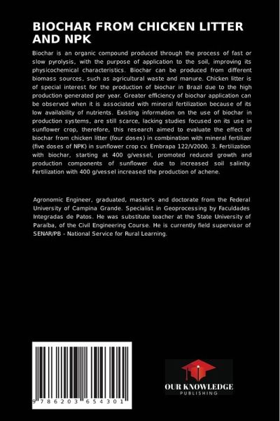 Biochar is an organic compound produced through the process of fast or slow pyrolysis, with the purpose of application to the soil, improving its physicochemical characteristics. Biochar can be produced from different biomass sources, such as agricultural waste and manure. Chicken litter is of special interest for the production of biochar in Brazil due to the high production generated per year. Greater efficiency of biochar application can be observed when it is associated with mineral fertilization because of its low availability of nutrients. Existing information on the use of biochar in production systems, are still scarce, lacking studies focused on its use in sunflower crop, therefore, this research aimed to evaluate the effect of biochar from chicken litter (four doses) in combination with mineral fertilizer (five doses of NPK) in sunflower crop cv. Embrapa 122/V2000. 3. Fertilization with biochar, starting at 400 g/vessel, promoted reduced growth and production components of sunflower due to increased soil salinity. Fertilization with 400 g/vessel increased the production of achene.