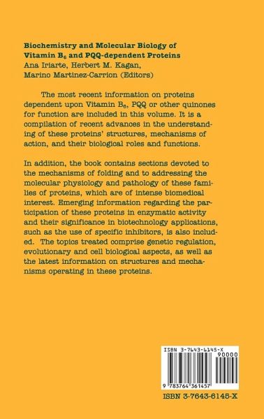 Molecular Regulation of Enzymes Controlling Levels of Vitamin B6.- Genetic, Genomic Approaches for Delineating the Pathway of Pyridoxal 5'-Phosphate Coenzyme Biosynthesis inEscherichia coli.- Enzymes Catalysing Formation of Pyridoxal Phosphate from Vitamin B6.- A Divergence in the Biosynthetic Pathway, a New Role for Vitamin B6.- Molecular Cloning, Catalytic Properties of Human Brain Pyridoxal Kinase.- Regulation of Gene Expression of PLP-dependent Proteins.- Regulation of the Aspartate,Alanine Aminotransferases in Human, Rodents.- Mimosine's Mechanism is Pyridoxal-Phosphate Independent.- Environmental Stimuli, Regulatory Factors Affecting the Expression of the Glutamic Acid Decarboxylase System in Escherichia coli.- PQQ, Quinoproteins: Biology, Regulation.- The Membrane Glucose Dehydrogenase of Escherichia coli.- Structural Properties of Homodimeric Quinoprotein Ethanol Dehydrogenase from Pseudomonas aeruginosa.- Physiological Importance of Pyrroloquinoline Quinone.- Mechanism of Topa Quinone Biogenesis in Copper Amine Oxidase Studied by Site-Directed Mutagenesis, X-ray Crystallography.- Lysyl Oxidase Activates the Transcription Activity of Collagen III Promoter: Possible Involvement of KU Antigen.- TGF-ß l Regulation of Gingival Lysyl Oxidase, Connective Tissue Growth Factor.- Pyridoxine, Dopa Decarboxylase, Tetrahydroisoquinoline Derivatives in Parkinson's Disease.- Lysyl Oxidase.- Lysyl Oxidase: A Family of Multifunctional Proteins.- Structural Aspects of Lysyl Oxidase.- Chemotaxis of Vascular Smooth Muscle Cells by Lysyl Oxidase.- Evolution, Biological Implications.- Biological Implications of the Different Hsp70 Binding Properties of Mitochondrial, Cytosolic Aspartate Aminotransferase.- Molecular Evolution of Alanine: Glyoxylate AminotransferaseIntracellular Targeting.- Common Structural Elements in the Architecture of the Cofactor-Binding Domains in Unrelated Families of Pyridoxal-dependent Enzymes.- Mitochondrial Localization of Eukaryotic NifS-Like Proteins.- Mechanistic Studies of 8-Amino-7-Oxononanoate Synthase.- Tryptophan Synthase, Tryptophanase, Serine Transhydroxymethylase.- Structure, Function of Tryptophan Synthase.- Salt Bridging, Movalent Cation Binding Regulate Catalysis, Channeling in Tryptophan Synthase.- Equilibrium Isotope Effects: Evidence for Low-Barrier H-Bonding in Tryptophanase.- 3-Dimensional Structures of Rabbit Cytosolic, E. coli Serine Hydroxymethyltransferase.- Role of Y65, E57 in Escherichia coli Serine Hydroxymethyltransferase.- Reaction, Structure of 1-aminocyclopropane- 1 -carboxylate Deaminase.- Transaminases.- Refined Reaction Mechanism of Aspartate Aminotransferase.- 1H, 15N NMR Spectroscopy of Aspartate Aminotransferase, Related Schiff Bases, Tautomerism in Enzyme Active Sites.- Structure, Induced Fit, Substrate Recognition of E. coli Branched-Chain Amino Acid Aminotransferase.- Structure, Mechanisms of Quinoenzymes.- Tryptophan Tryptophylquinone Enzymes: Structure, Function.- Continuous-Flow Column Electrolytic Spectroelectrochemical Method for Determination of Protein Redox Potentials - Application to Quinoproteins.- Enantioselectivity of PQQ-containing Alcohol Dehydrogenases: Kinetic,Thermodynamic, Molecular Modeling.- Structural Studies of a Soluble Monomeric Quinohemoprotein Alcohol Dehydrogenase from Pseudomonas putida HK5.- Electron Transport Systems for Quinohemoprotein Type II Alcohol Dehydrogenase of Pseudomonas putida HK5.- Cellular,Molecular Biology: Models with PLP-Dependent Proteins.- Activation,Transformation of Cells Induce Translocation of Ornithine Decarboxylase (ODC) to the Surface Membrane.- A Partially Folded Conformation Is Not the Only Requirement for Import of Mitochondrial Aspartate Aminotransferase.- Engineering of B6Enzymes.- Association of Newly Synthesized Mitochondrial Aspartate Aminotransferase with Cytosolic.- Heterologous Expression, Purification of Serine Palmitoyltranferase.- Dehydratases, Lyases, Other PLP-dependent Proteins.- 5-Aminolevulinate Synthase: Pre-Steady State Reaction, Functional Role of Specific Active Site Residues.- Functional Role of PLP in Bacterial Phosphorylases.- Inhibition, Structural Changes of O-Acetylserine SulEhydrylase-A from Salmonella typhimurium upon Binding Sulfate, Chloride Anions.- Structure-Function Relationships of Porcine Pyridoxal Kinase.- The Contribution of a Conformationally-Mobile, Active-Site Loop to the Reaction Catalysed by Glutamate Semialdehyde Aminomutase.- The Reactions of Glutamate 1-Semialdehyde Aminomutase with (R), (S) Enantiomers of a Novel, Mechanism-Based Inhibitor, 2, 3-Diaminopropyl Sulfate.- Structure, Function of E. Coli Pyridoxine Phosphate Oxidase.- Molecular Pathology, Medicine.- Role of Branched Chain Aminotransferase Isoenzymes in the Central Nervous System.- Modulation of Gene Expression by Vitamin B6.- Pyridoxal 5'-phosphate, Calcium Channels.- GABA-aminotransferase, a Target for Antiepileptic Drug Therapy.- Decarboxylases, D-Amino Acid Transaminase.- Mouse Ornithine Decarboxylase: Structural Comparisons to Other PLP-Dependent Enzymes.- Structural, Mechanistic Studies of Trypanosoma brucei Ornithine Decarboxylase.- Mechanistic Analysis of Dialkylglycine Decarboxylase.- Studies on an Active Site Residue, E177, That Affects Binding of the Coenzyme in D-Amino Acid Transaminase, Mechanistic Studies on a Suicide Substrate.- Biotechnology,Applications of Emerging Technologies.- Functional Properties of Immobilized Pyridoxal 5'-phosphate-dependent Enzymes Probed by Absorption Microspectrophotometry.- Characterization of Recombinant Porcine Pyridoxal Kinase Using Surface Plasmon Resonance Biosensor Technique.- Three-Dimensional Model of the ATP-Binding Domain of Pyridoxal Kinase.- Structural Fluctuations of Pyridoxal Kinase: Effect of Viscogen Cosolvents.- The Aspartate Aminotransferase Folding Intermediates Recognized by GroEL are Partially Folded Monomers that Bind Pyridoxal Phosphate.- Author Index.
