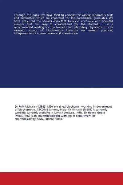 Through this book, we have tried to compile the various laboratory tests and parameters which are important for the paramedical graduates. We have presented the various important topics in a concise and oriented manner that are easy to comprehend for the students. It is a recommended reading for the trainees and laboratory physicians. It is an excellent source of biochemistry literature on current practices, indispensable for course review and examination.