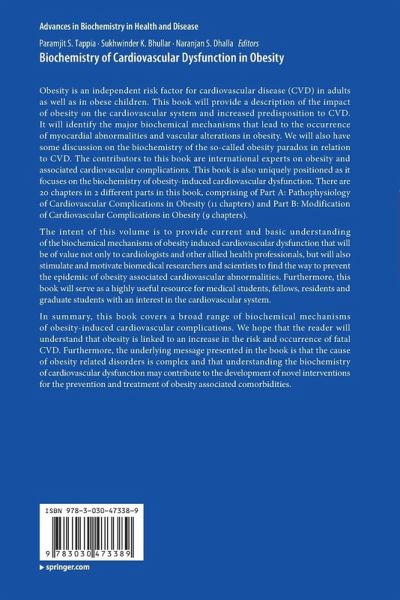 Obesity is an independent risk factor for cardiovascular disease (CVD) in adults as well as in obese children. This book will provide a description of the impact of obesity on the cardiovascular system and increased predisposition to CVD. It will identify the major biochemical mechanisms that lead to the occurrence of myocardial abnormalities and vascular alterations in obesity. We will also have some discussion on the biochemistry of the so-called obesity paradox in relation to CVD. The contributors to this book are international experts on obesity and associated cardiovascular complications. This book is also uniquely positioned as it focuses on the biochemistry of obesity-induced cardiovascular dysfunction. There are 20 chapters in 2 different parts in this book, comprising of Part A: Pathophysiology of Cardiovascular Complications in Obesity (11 chapters) and Part B: Modification of Cardiovascular Dysfunction in obesity (9 chapters). Theintent of this volume is to provide current and basic understanding of the biochemical mechanisms of obesity induced cardiovascular dysfunction that will be of value not only to cardiologists and other allied health professionals, but will also stimulate and motivate biomedical researchers and scientists to find the way to prevent the epidemic of obesity associated cardiovascular abnormalities. Furthermore, this book will serve as a highly useful resource for medical students, fellows, residents and graduate students with an interest in the cardiovascular system.