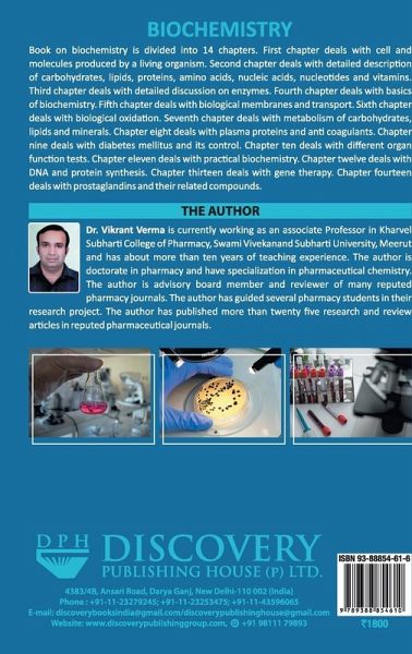 Book on biochemistry is divided into 14 chapters. First chapter deals with cell and molecules produced by a living organism. Second chapter deals with detailed description of carbohydrates, lipids, proteins, amino acids, nucleic acids, nucleotides and vitamins. Third chapter deals with detailed discussion on enzymes. Fourth chapter deals with basics of biochemistry. Fifth chapter deals with biological membranes and transport. Sixth chapter deals with biological oxidation. Seventh chapter deals with metabolism of carbohydrates, lipids and minerals. Chapter eight deals with plasma proteins and anti coagulants. Chapter nine deals with diabetes mellitus and its control. Chapter ten deals with different organ function tests. Chapter eleven deals with practical biochemistry. Chapter twelve deals with DNA and protein synthesis. Chapter thirteen deals with gene therapy. Chapter fourteen deals with prostaglandins and their related compounds.