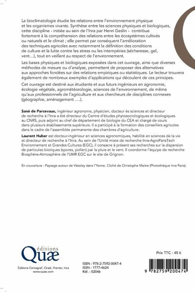 La bioclimatologie étudie les relations entre les écosystèmes cultivés ou naturels et le climat. Les démarches agronomiques et les techniques agricoles peuvent ainsi être améliorées tout en veillant au respect de l'environnement. Les bases physiques et biologiques exposées dans cet ouvrage, ainsi que diverses méthodes de mesure ou d'analyse, permettent de proposer des alternatives aux approches fondées sur des relations empiriques ou statistiques. Le livre donne aussi de nombreux exemples d'applications qui découlent de ces principes. Public: étudiants, futurs ingénieurs en agronomie, écologie végétale, agrométéorologie et sciences de l'environnement, professionnels de l'agriculture et chercheurs de disciplines connexes.