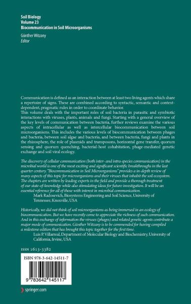 "The discovery of cellular communication (both inter- and intra-species communication) in the microbial world is one of the most exciting and significant scientific breakthroughs in the last quarter century. "Biocommunication in Soil Microorganisms" provides a in-depth review of many aspects of this topic for microorganisms and their viruses that inhabit the soil ecosystem. The chapters are written by leading experts in the field and provide a thorough treatment of our state-of-knowledge while also stimulating ideas for future investigation. It will be an essential reference for all of those with interest in microbial communication."
