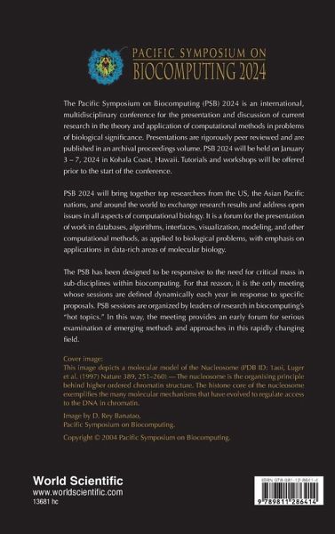 The Pacific Symposium on Biocomputing (PSB) 2024 is an international, multidisciplinary conference for the presentation and discussion of current research in the theory and application of computational methods in problems of biological significance. Presentations are rigorously peer reviewed and are published in an archival proceedings volume. PSB 2024 will be held on January 3 - 7, 2024 in Kohala Coast, Hawaii. Tutorials and workshops will be offered prior to the start of the conference. PSB 2024 will bring together top researchers from the US, the Asian Pacific nations, and around the world to exchange research results and address open issues in all aspects of computational biology. It is a forum for the presentation of work in databases, algorithms, interfaces, visualization, modeling, and other computational methods, as applied to biological problems, with emphasis on applications in data-rich areas of molecular biology. The PSB has been designed to be responsive to the need for critical mass in sub-disciplines within biocomputing. For that reason, it is the only meeting whose sessions are defined dynamically each year in response to specific proposals. PSB sessions are organized by leaders of research in biocomputing's "hot topics." In this way, the meeting provides an early forum for serious examination of emerging methods and approaches in this rapidly changing field.