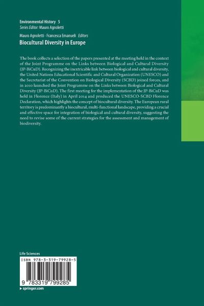 The book collects a selection of the papers presented at the meeting held in the context of the Joint Programme on the Links between Biological and Cultural Diversity (JP-BiCuD). Recognizing the inextricable link between biological and cultural diversity, the United Nations Educational Scientific and Cultural Organization (UNESCO) and the Secretariat of the Convention on Biological Diversity (SCBD) joined forces, and in 2010 launched the Joint Programme on the Links between Biological and Cultural Diversity (JP-BiCuD). The first meeting for the implementation of the JP-BiCuD was held in Florence (Italy) in April 2014 and produced the UNESCO-sCBD Florence Declaration, which highlights the concept of biocultural diversity. The European rural territory is predominantly a biocultural, multi-functional landscape, providing a crucial and effective space for integration of biological and cultural diversity, suggesting the need to revise some of the current strategies for the assessment and management of biodiversity.