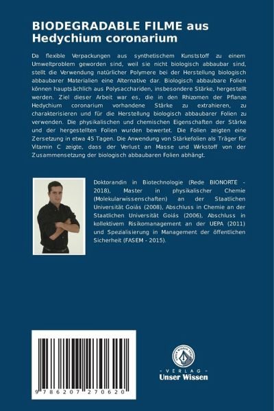 Da flexible Verpackungen aus synthetischem Kunststoff zu einem Umweltproblem geworden sind, weil sie nicht biologisch abbaubar sind, stellt die Verwendung natürlicher Polymere bei der Herstellung biologisch abbaubarer Materialien eine Alternative dar. Biologisch abbaubare Folien können hauptsächlich aus Polysacchariden, insbesondere Stärke, hergestellt werden. Ziel dieser Arbeit war es, die in den Rhizomen der Pflanze Hedychium coronarium vorhandene Stärke zu extrahieren, zu charakterisieren und für die Herstellung biologisch abbaubarer Folien zu verwenden. Die physikalischen und chemischen Eigenschaften der Stärke und der hergestellten Folien wurden bewertet. Die Folien zeigten eine Zersetzung in etwa 45 Tagen. Die Anwendung von Stärkefolien als Träger für Vitamin C zeigte, dass der Verlust an Masse und Wirkstoff von der Zusammensetzung der biologisch abbaubaren Folien abhängt.