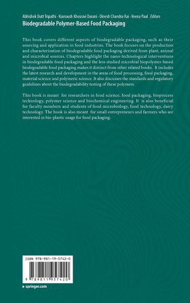 Chapter 1. Introduction-Scope and importance of biodegradable polymers.- Chapter 2. Plant derived biopolymers in food packaging-current status and market potential.- Chapter 3. Plants and Animal Derived Enzymes and Their Potential Application in Food Processing and Preservation.- Chapter 4. Microbial derived biodegradable polymers as food packaging tool.- Chapter 5. Polyhdroxyalkanoates (PHAs) in Food packaging.- Chapter 6. Green polymer based biodegradable packaging.- Chapter 7. Role of agro-waste in economical food packaging synthesis.- Chapter 8. Enzymes involved in synthesis of biodegradable food packaging materials.- Chapter 9. Metabolic engineering for the synthesis of biodegradable polymers with potential applications in food packaging.- Chapter 10. Downstream processing strategies for synthesis of biodegradable polymers.- Chapter 11. Functionality test methods for biodegradable polymers.- Chapter 12. Nanocomposite biodegradable polymers for food packaging.- Chapter 13. Application of biopolymer blends as edible films and coatings in food packaging.- Chapter 14. Biopolymer based active and intelligent packaging for food applications.- Chapter 15. Standards and guidelines for testing biodegradability of bio-plastic.- Chapter 16. Future prospects of Biodegradable polymers in Food industry.
