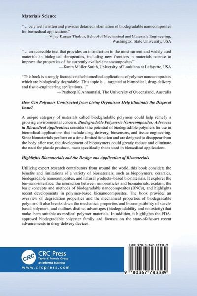 How Can Polymers Constructed From Living Organisms Help Eliminate the Disposal Issue? A unique category of materials called biodegradable polymers could help remedy a growing environmental concern. Biodegradable Polymeric Nanocomposites: Advances in Biomedical Applications considers the potential of biodegradable polymers for use in biomedical applications that include drug delivery, biosensors, and tissue engineering. Since biomaterials perform on a time-limited function and are designed to disappear from the body after use, the development of biopolymers could greatly reduce and eliminate the need for plastic products, most specifically those used in biomedical applications. Highlights Biomaterials and the Design and Application of Biomaterials Utilizing expert research contributors from around the world, this book considers the benefits and limitations of a variety of biomaterials, such as biopolymers, ceramics, biodegradable nanocomposites, and natural products-based biomaterials. It explores the bio-nano-interface; the interaction between nanoparticles and biomaterials, explains the basic concepts and methods of biodegradable nanocomposites (BNCs), and highlights recent developments in polymer-based bionanocomposites. The book provides an overview of degradation properties and the mechanical properties of biodegradable polymers. It also breaks down the mechanical properties and biocompatibility of starch-based polymers, and outlines distinct advantages (biodegradability and nontoxicity) that make them suitable as medical polymer materials. In addition, it highlights the FDA-approved biodegradable polyester family and focuses on the state-of-the-art recent advancements in drug-delivery devices. Biodegradable Polymeric Nanocomposites: Advances in Biomedical Applications provides current knowledge on biopolymers, examines recent developments and trends, and considers future applications of polymers. Featuring the work of highly-qualified international researchers, this book addresses applications relevant to polymer and material science, as well as material, biomedical, and chemical engineering, and is of specific interest to polymer science engineers.