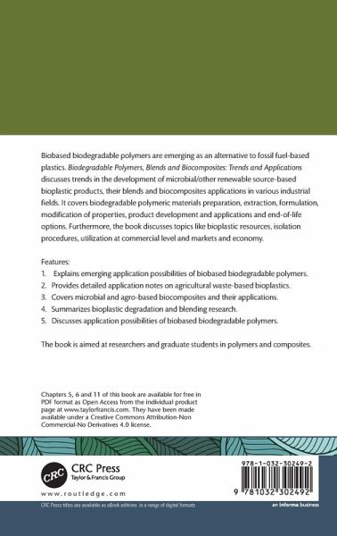 Biobased biodegradable polymers are emerging as an alternative to fossil fuel-based plastics. Biodegradable Polymers, Blends and Biocomposites: Trends and Applications discusses trends in the development of microbial/other renewable source-based bioplastic products, their blends and biocomposites applications in various industrial fields. It covers biodegradable polymeric materials preparation, extraction, formulation, modification of properties, product development and applications and end-of-life options. Furthermore, the book discusses topics like bioplastic resources, isolation procedures, utilization at commercial level and markets and economy.