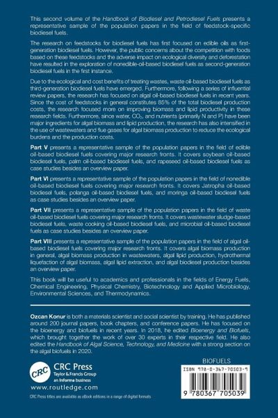 This second volume of the Handbook of Biodiesel and Petrodiesel Fuels presents a representative sample of the population papers in the field of feedstock-specific biodiesel fuels. The research on feedstocks for biodiesel fuels has first focused on the edible oils as first-generation biodiesel fuels. However, the public concerns about the competition with foods based on these feedstocks and adverse impact on the ecological diversity and deforestation have resulted in the exploration of nonedible-oil-based biodiesel fuels as second-generation biodiesel fuels in the first instance. Due to the ecological and cost benefits of treating wastes, waste oil-based biodiesel fuels as third-generation biodiesel fuels have emerged. Furthermore, following a series of influential review papers, the research has focused on the algal oil-based biodiesel fuels in recent years. Since the cost of feedstocks in general constitutes 85% of the total biodiesel production costs, the research focused more on improving biomass and lipid productivity in these research fields. Furthermore, since water, CO2, and nutrients (primarily N and P) have been major ingredients for the algal biomass and lipid production, the research has also intensified in the use of wastewaters and flue gases for algal biomass production to reduce the ecological burdens and the production costs. Part 1 presents a representative sample of the population papers in the field of edible oil-based biodiesel fuels covering major research fronts. It covers soybean oil-based biodiesel fuels, palm oil-based biodiesel fuels, and rapeseed oil-based biodiesel fuels as case studies besides an overview paper. Part 2 presents a representative sample of the population papers in the field of nonedible oil-based biodiesel fuels covering major research fronts. It covers Jatropha oil-based biodiesel fuels, polanga oil-based biodiesel fuels, and moringa oil-based biodiesel fuels as case studies besides an overview paper. Part 3 presents a representative sample of the population papers in the field of waste oil-based biodiesel fuels covering major research fronts. It covers wastewater sludge-based biodiesel fuels, waste cooking oil-based biodiesel fuels, and microbial oil-based biodiesel fuels as case studies besides an overview paper. Part 4 presents a representative sample of the population papers in the field of algal oil-based biodiesel fuels covering major research fronts. It covers algal biomass production in general, algal biomass production in wastewaters, algal lipid production, hydrothermal liquefaction of algal biomass, algal lipid extraction, and algal biodiesel production besides an overview paper. This book will be useful to academics and professionals in the fields of Energy Fuels, Chemical Engineering, Physical Chemistry, Biotechnology and Applied Microbiology, Environmental Sciences, and Thermodynamics. Ozcan Konur is both a materials scientist and social scientist by training. He has published around 200 journal papers, book chapters, and conference papers. He has focused on the bioenergy and biofuels in recent years. In 2018, he edited 'Bioenergy and Biofuels', that brought together the work of over 30 experts in their respective field. He also edited 'Handbook of Algal Science, Technology, and Medicine' with a strong section on the algal biofuels in 2020.