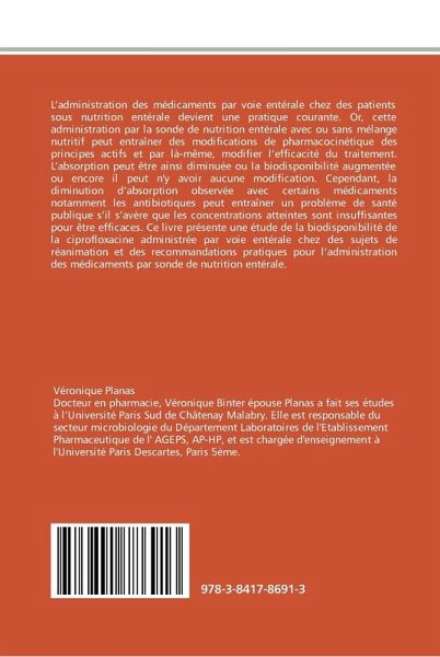 L'administration des médicaments par voie entérale chez des patients sous nutrition entérale devient une pratique courante. Or, cette administration par la sonde de nutrition entérale avec ou sans mélange nutritif peut entraîner des modifications de pharmacocinétique des principes actifs et par là-même, modifier l'efficacité du traitement. L'absorption peut être ainsi diminuée ou la biodisponibilité augmentée ou encore il peut n'y avoir aucune modification. Cependant, la diminution d'absorption observée avec certains médicaments notamment les antibiotiques peut entraîner un problème de santé publique s'il s'avère que les concentrations atteintes sont insuffisantes pour être efficaces. Ce livre présente une étude de la biodisponibilité de la ciprofloxacine administrée par voie entérale chez des sujets de réanimation et des recommandations pratiques pour l'administration des médicaments par sonde de nutrition entérale.
