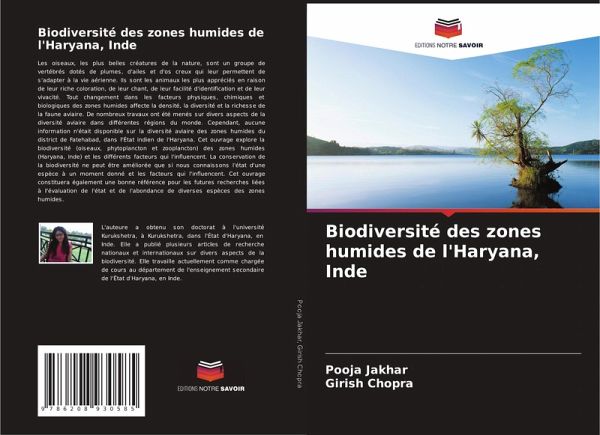 Les oiseaux, les plus belles créatures de la nature, sont un groupe de vertébrés dotés de plumes, d'ailes et d'os creux qui leur permettent de s'adapter à la vie aérienne. Ils sont les animaux les plus appréciés en raison de leur riche coloration, de leur chant, de leur facilité d'identification et de leur vivacité. Tout changement dans les facteurs physiques, chimiques et biologiques des zones humides affecte la densité, la diversité et la richesse de la faune aviaire. De nombreux travaux ont été menés sur divers aspects de la diversité aviaire dans différentes régions du monde. Cependant, aucune information n'était disponible sur la diversité aviaire des zones humides du district de Fatehabad, dans l'État indien de l'Haryana. Cet ouvrage explore la biodiversité (oiseaux, phytoplancton et zooplancton) des zones humides (Haryana, Inde) et les différents facteurs qui l'influencent. La conservation de la biodiversité ne peut être améliorée que si nous connaissons l'état d'une espèce à un moment donné et les facteurs qui l'influencent. Cet ouvrage constituera également une bonne référence pour les futures recherches liées à l'évaluation de l'état et de l'abondance de diverses espèces des zones humides.