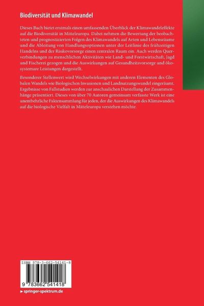 Dieses Buch bietet einen zusammenfassenden Überblick der Klimawandeleffekte für die Biodiversität in Mitteleuropa. Dabei nimmt die Bewertung der beobachteten und prognostizierten Folgen des Klimawandels auf Arten und Lebensräume und die Ableitung von Handlungsoptionen unter der Leitlinie des frühzeitigen Handelns und der Risikovorsorge einen zentralen Raum ein. Es werden auch Querverbindungen zu menschlichen Aktivitäten wie Land- und Forstwirtschaft, Jagd und Fischerei gezogen und die Implikationen für die Gesundheitsvorsorge dargestellt.