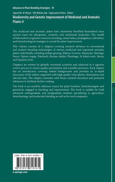 This volume consists of 13 chapters covering research advances in conventional and modern breeding technologies of various medicinal and important aromatic plants individually, including Indian ginseng, Datura, Licorice, Marjoram, Moringa, Neem, Opium poppy, Patchouli, Persian shallot, Plumbago, St John's-wort, Stevia, and Upastree resin.